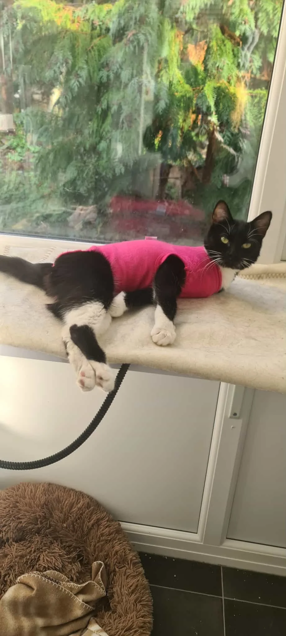 Bella is relaxing on her shelf with her legs stretched out in the photo. She’s quite happy wearing her vest to protect her spay site. Bella is a friendly cat, she’s calm and settles down to sleep, clearly loving her home comforts.