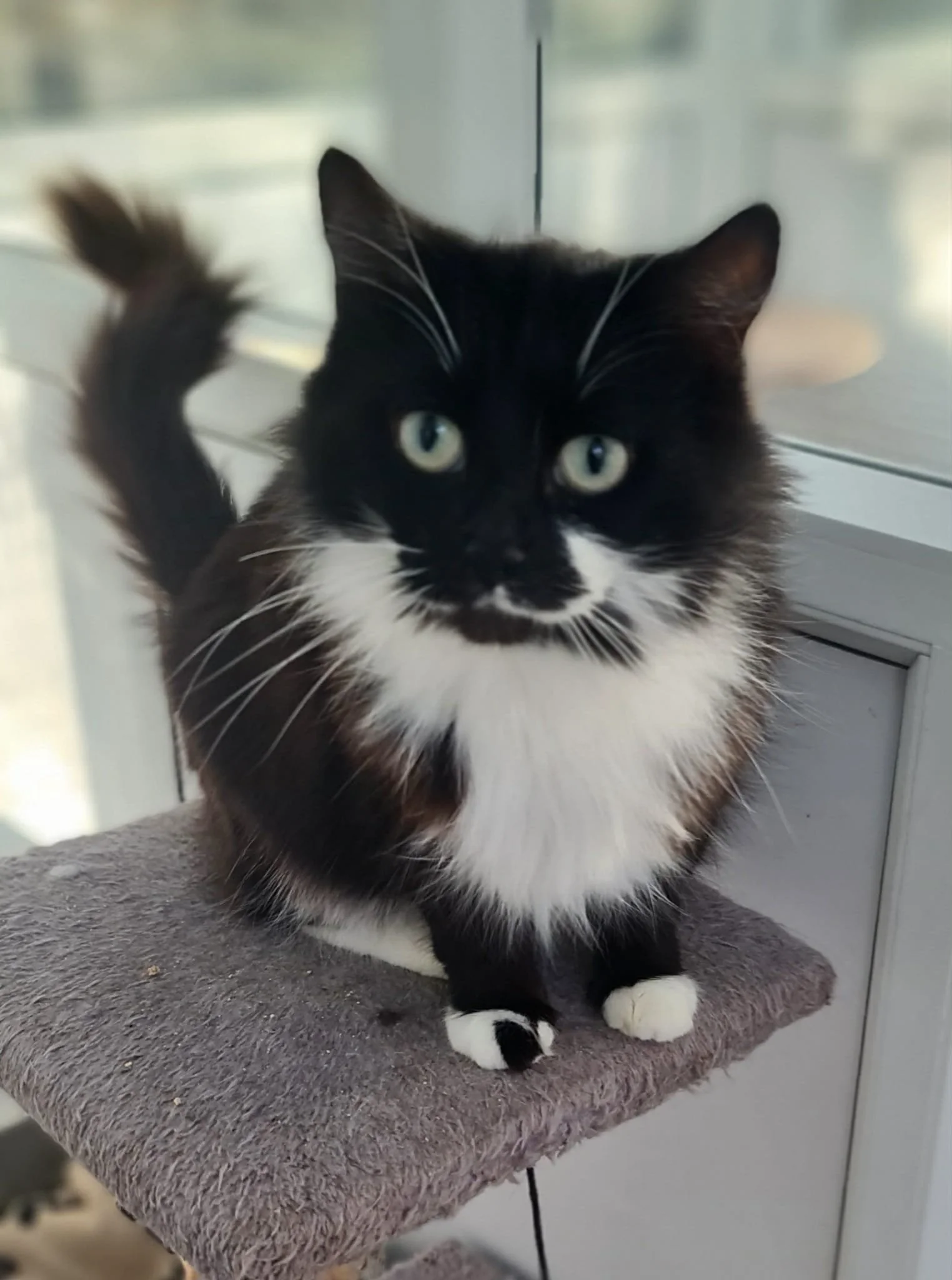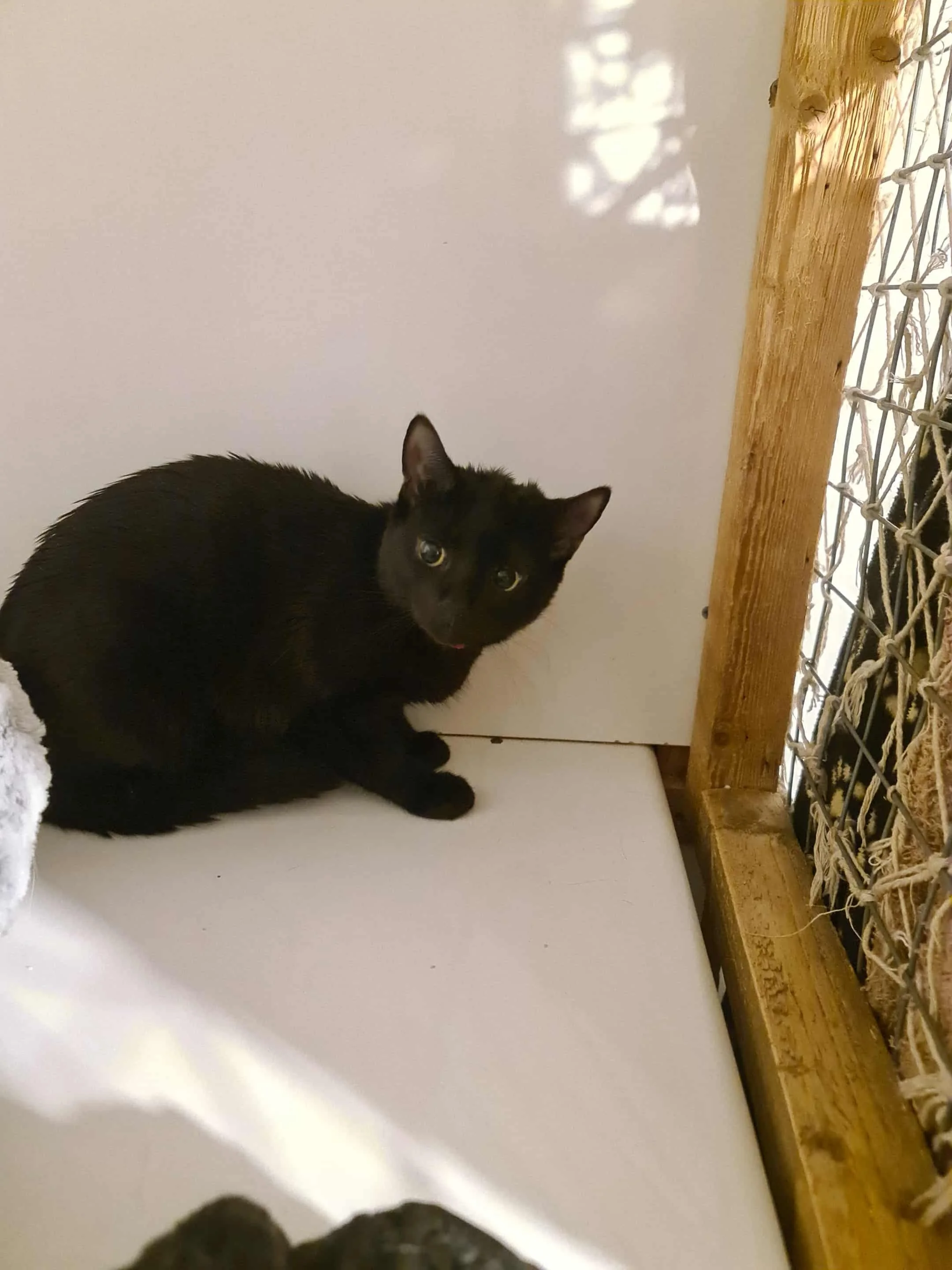 Sapphire and Coco were homed from us a few years ago. They are friendly cats who spend most of their time sitting on the shelf together. Coco has noisy breathing, but her health is good.