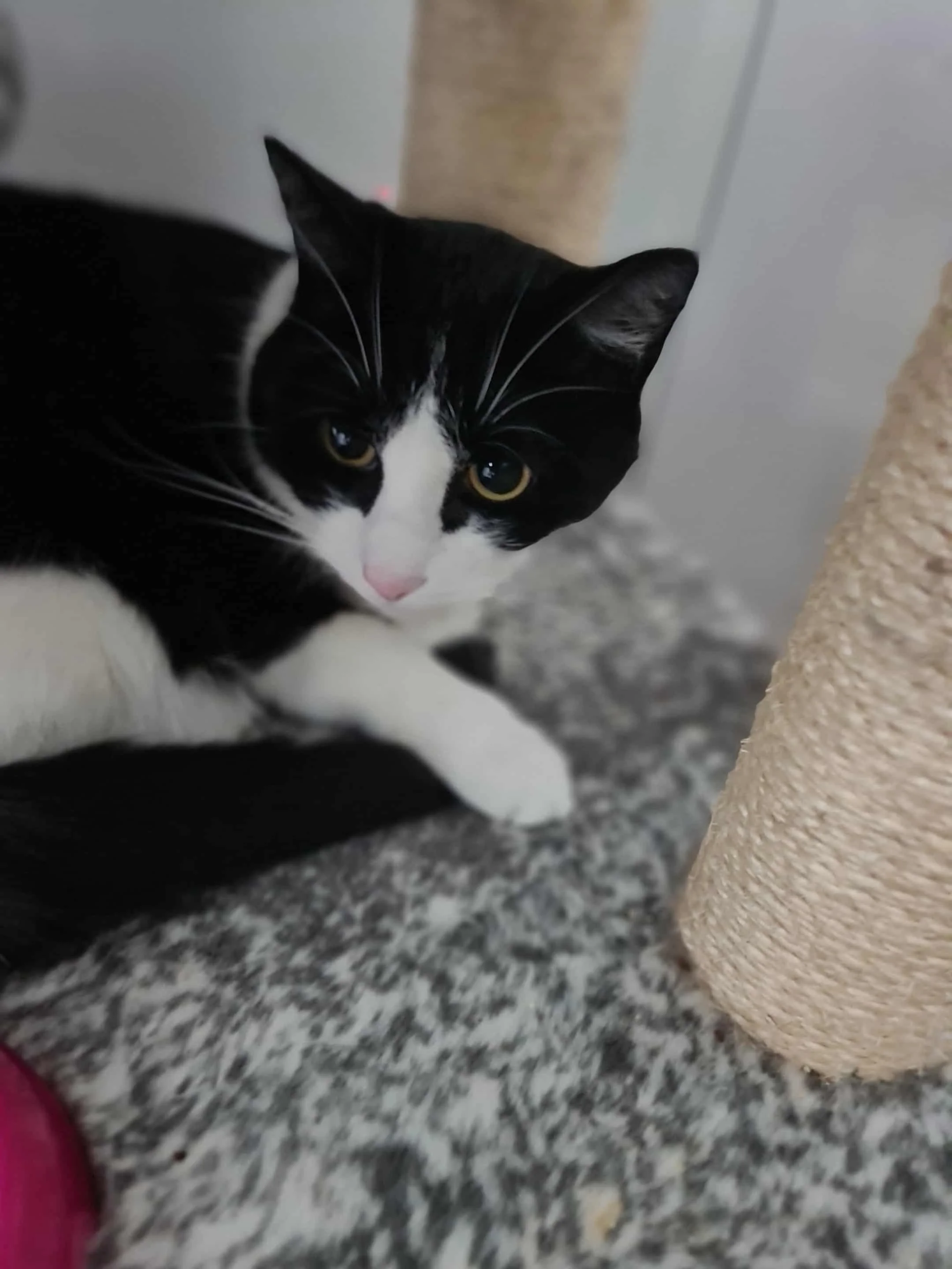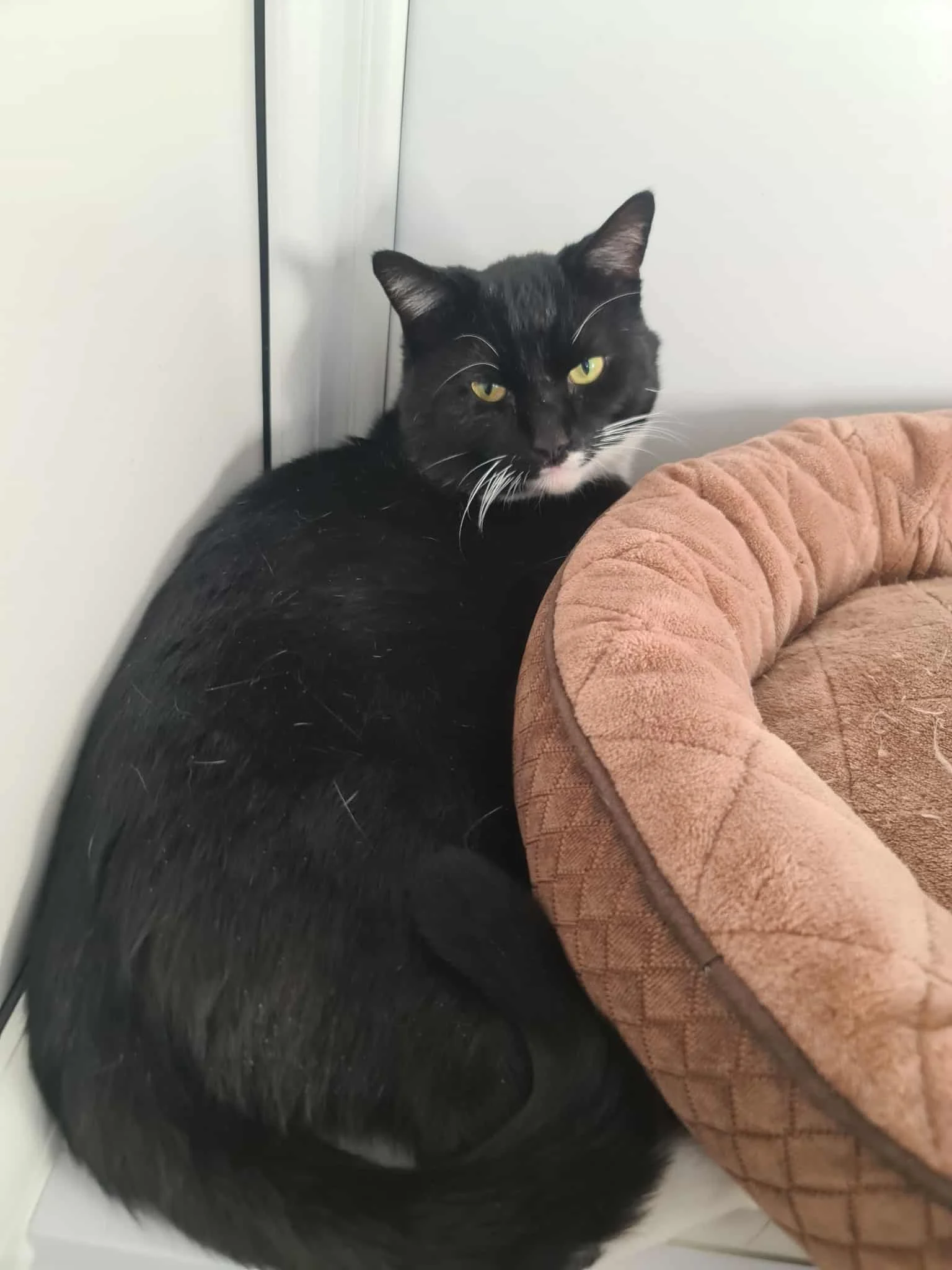Sparky was living as a stray in Birmingham. He’s really friendly, his love of food means he’s very easy to make friends with. For some reason he likes to lie behind his bed rather than in it. He’s probably waiting to use a human bed one he finds a home.