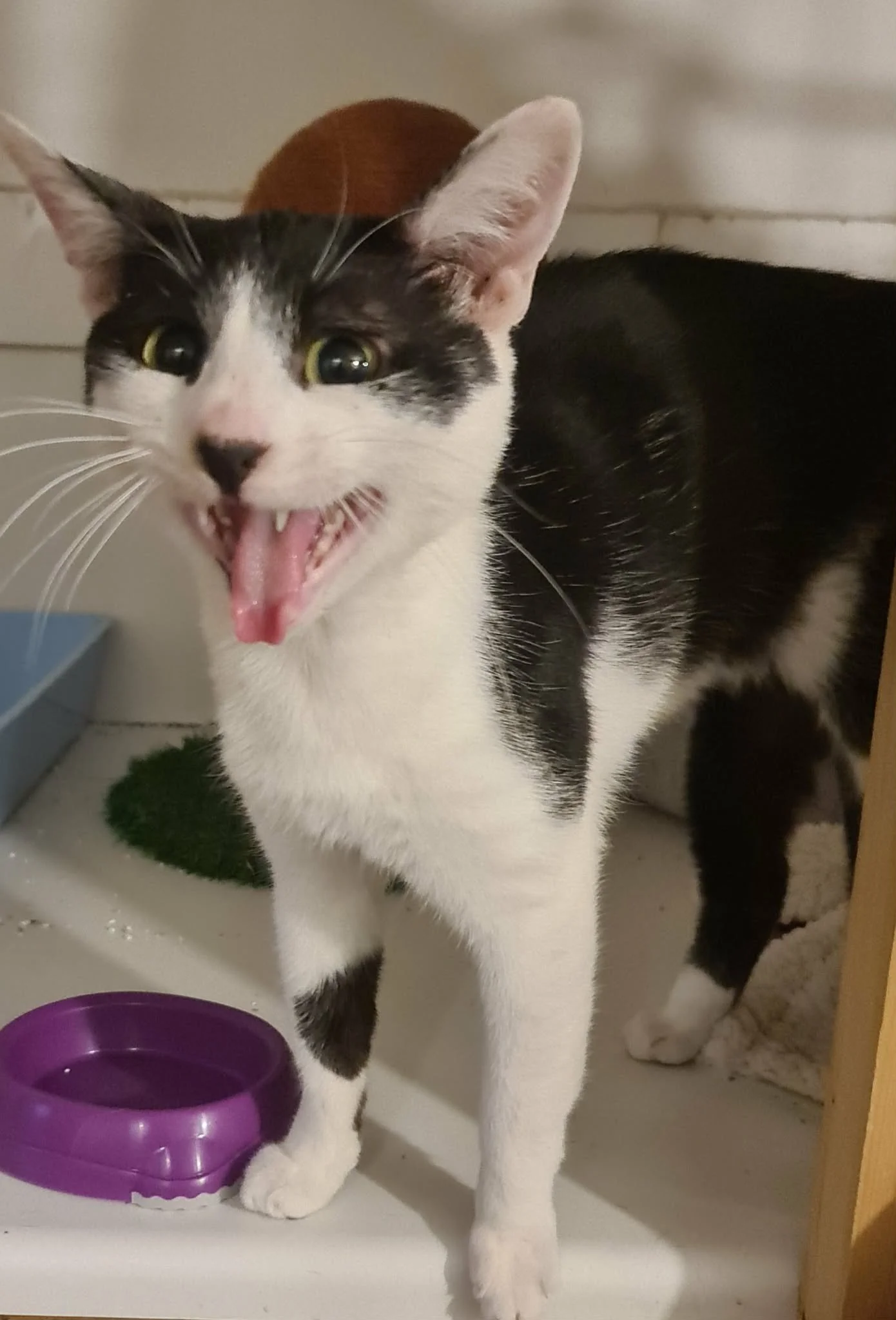 Cherio was found as a stray in Kineton. He was microchipped, but his owner didn’t want him and had given him away. As you can see from the photo, he is very vocal and doesn’t want to go hungry again, so he’s always asking for food at the moment. He’s scabby, but has been treated and his condition will improve as he gets the care he deserves. He plays like a kitten, adorable.